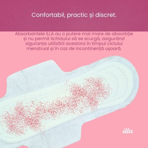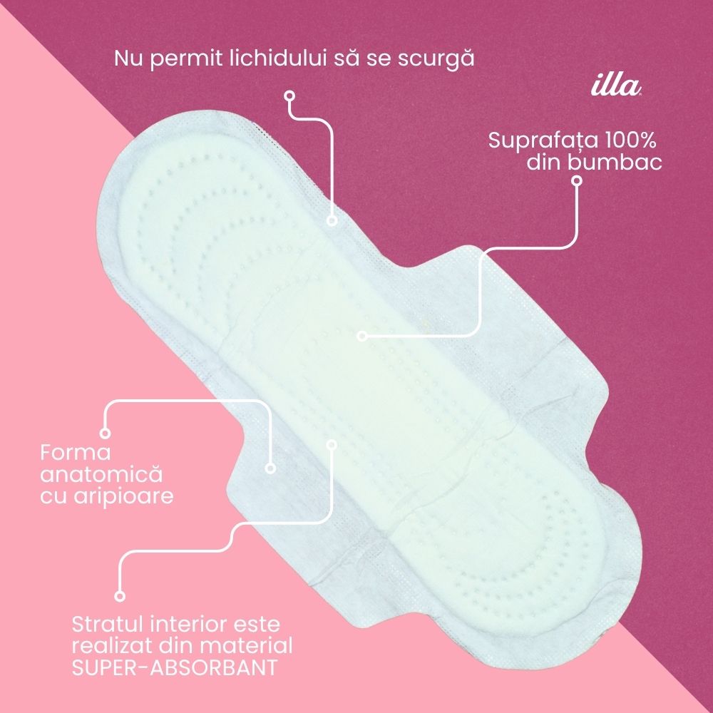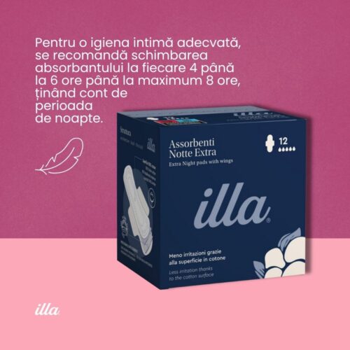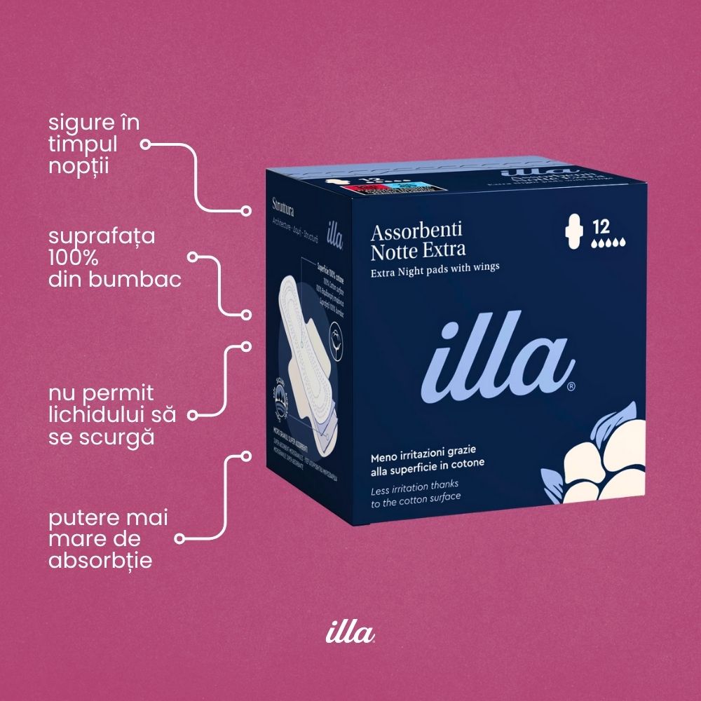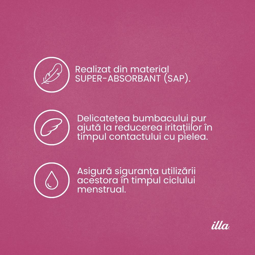 Absorbante de noapte extra din bumbac Illa® cu aloe vera, pentru flux menstrual abundent și nopți lungi. Particule superabsorbante SAP pentru protecție maximă fără scurgeri. Formă anatomică ultrasubțire pentru libertate de mișcare. Recomandate femeilor cu piele sensibilă. Testate dermatologic.