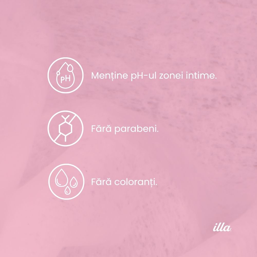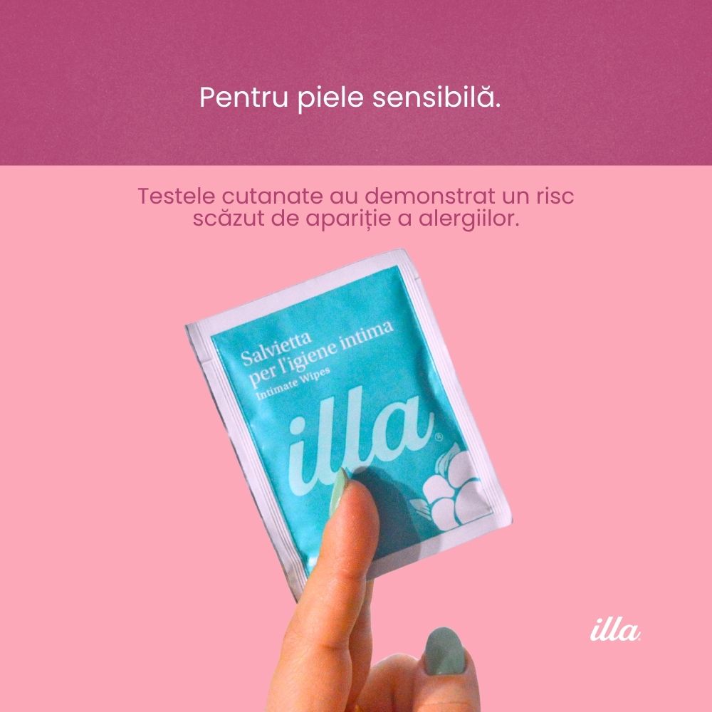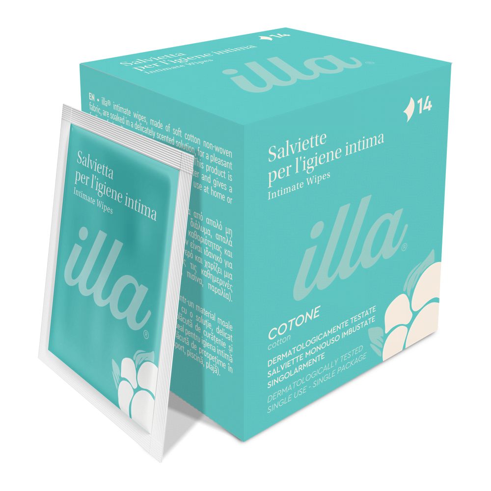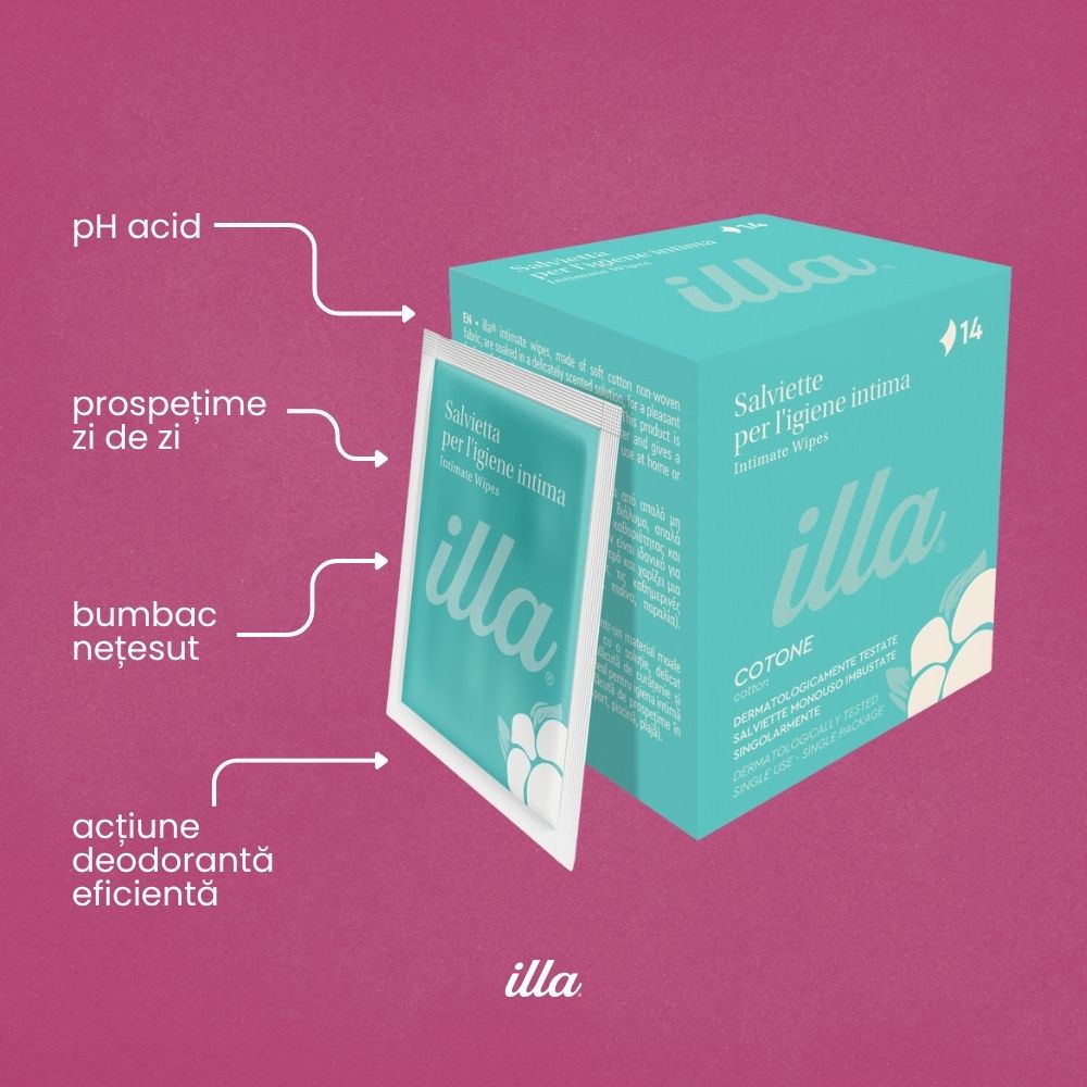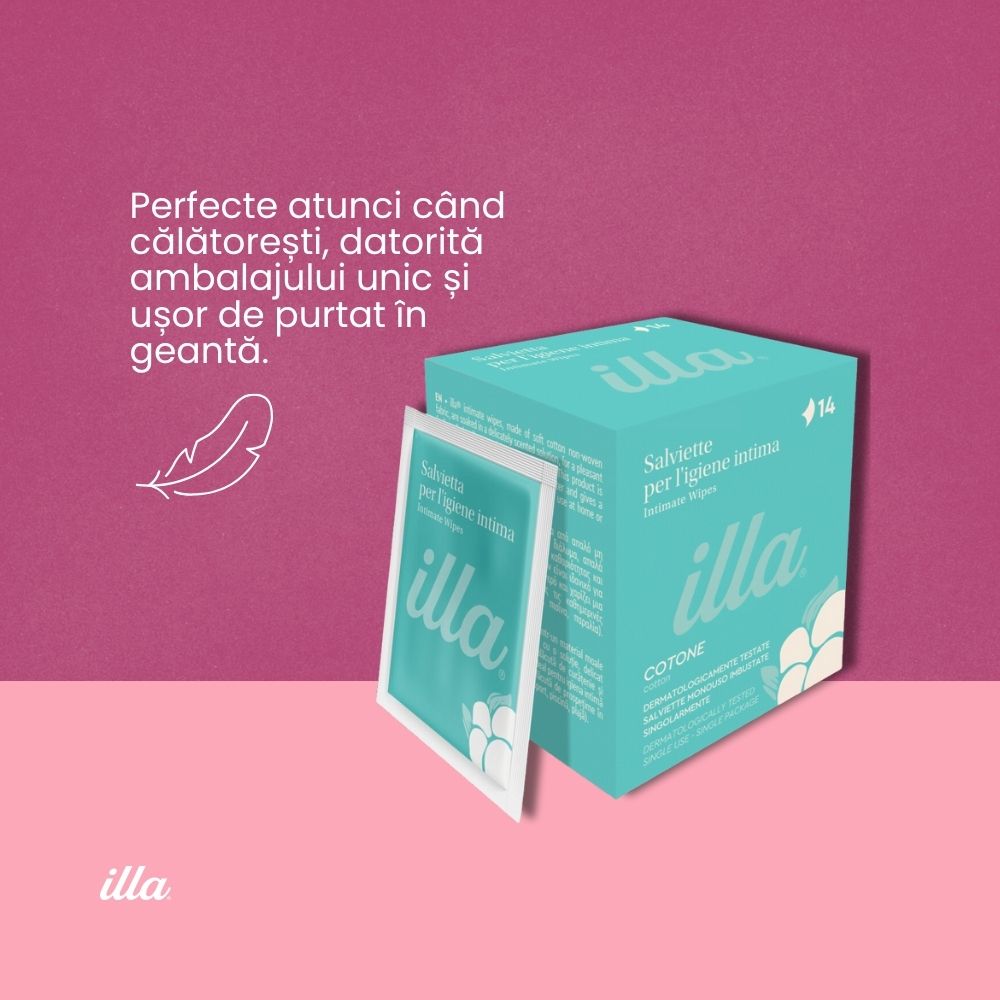 Șervețele intime din bumbac nețesut Illa®, ambalate individual, pentru igienă intimă rapidă și fără apă. Înmuiate în soluție cu pH acid și zinc — curățare ușoară cu acțiune deodorantă eficientă. Ideale pentru birou, sală de gimnastică, piscină sau plajă. Testate dermatologic, fără parabeni.