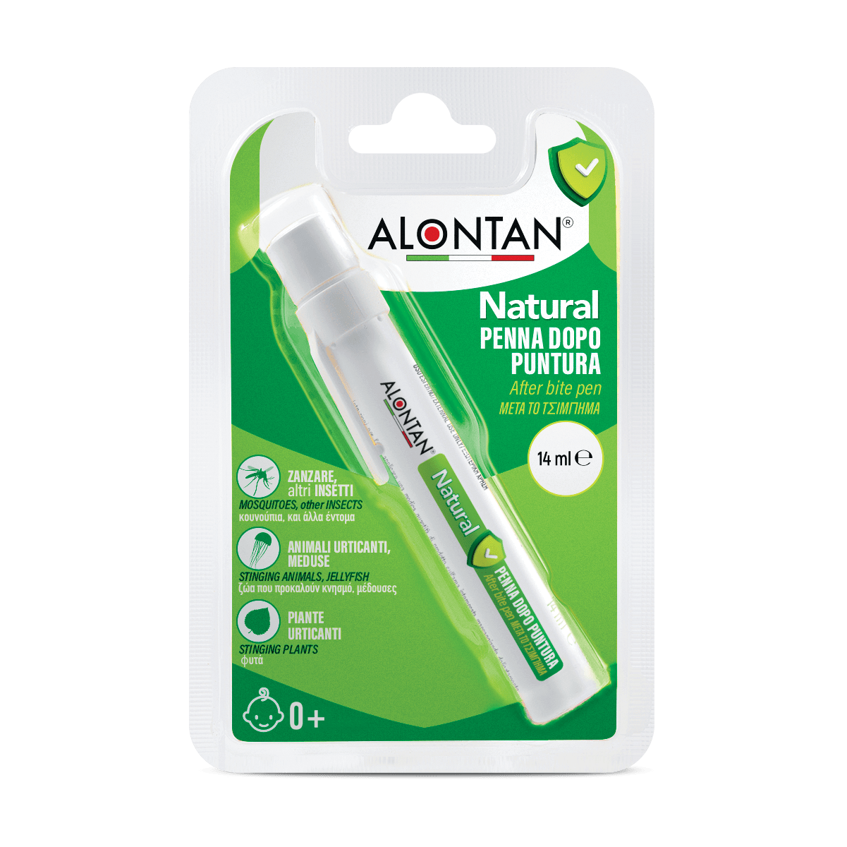 Soluție calmantă Alontan® Natural pentru ameliorarea rapidă a disconfortului după înțepături de insecte, contact cu plante urticante sau înțepături de meduze. Formula naturală cu extracte de mușețel, nalbă și gălbenele — efect calmant, antiinflamator și hidratant. Fără amoniac, cu aplicator tip „pen”. Indicată de la 0 luni.